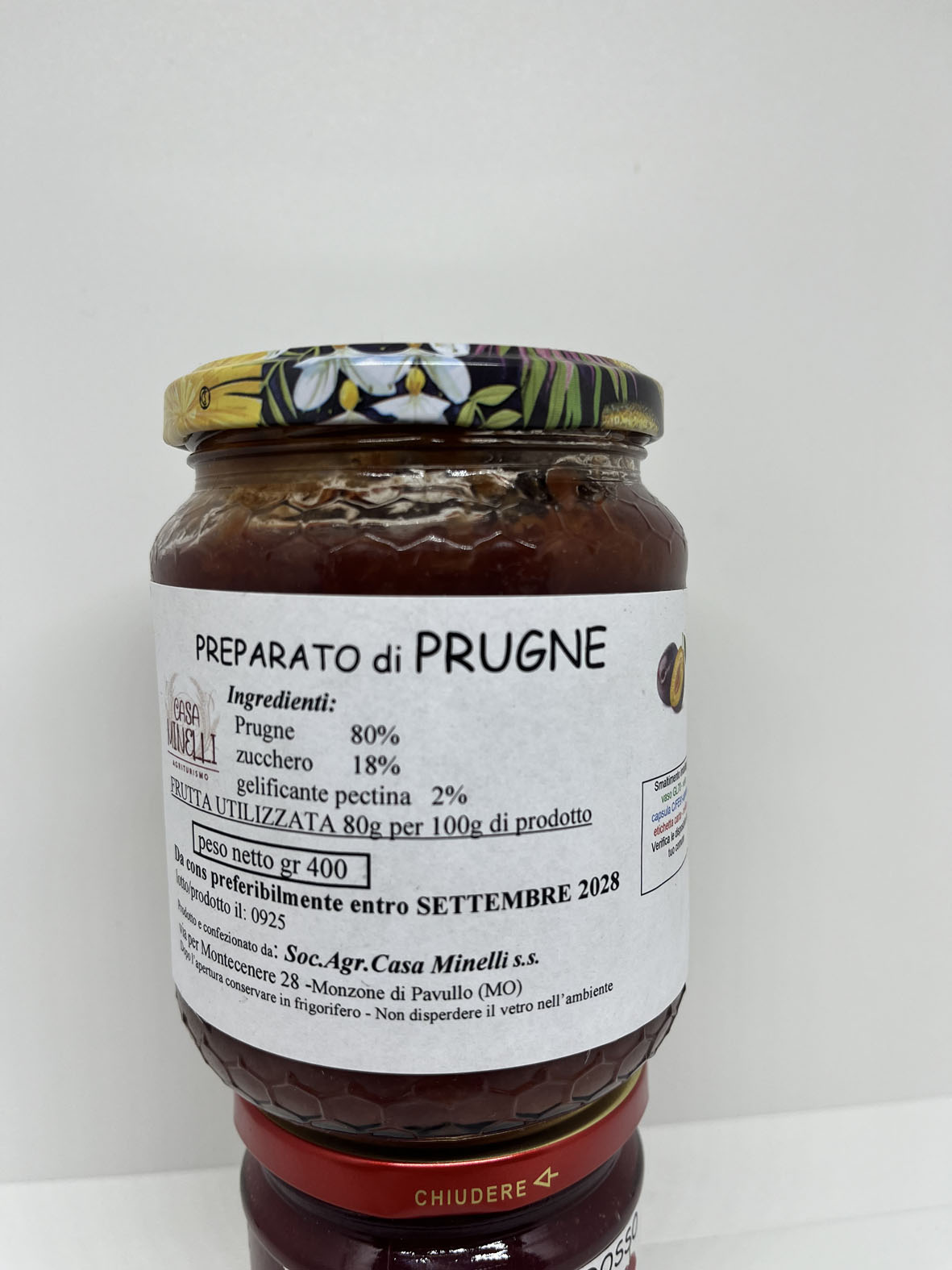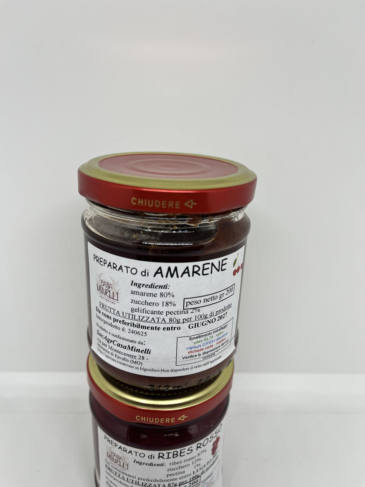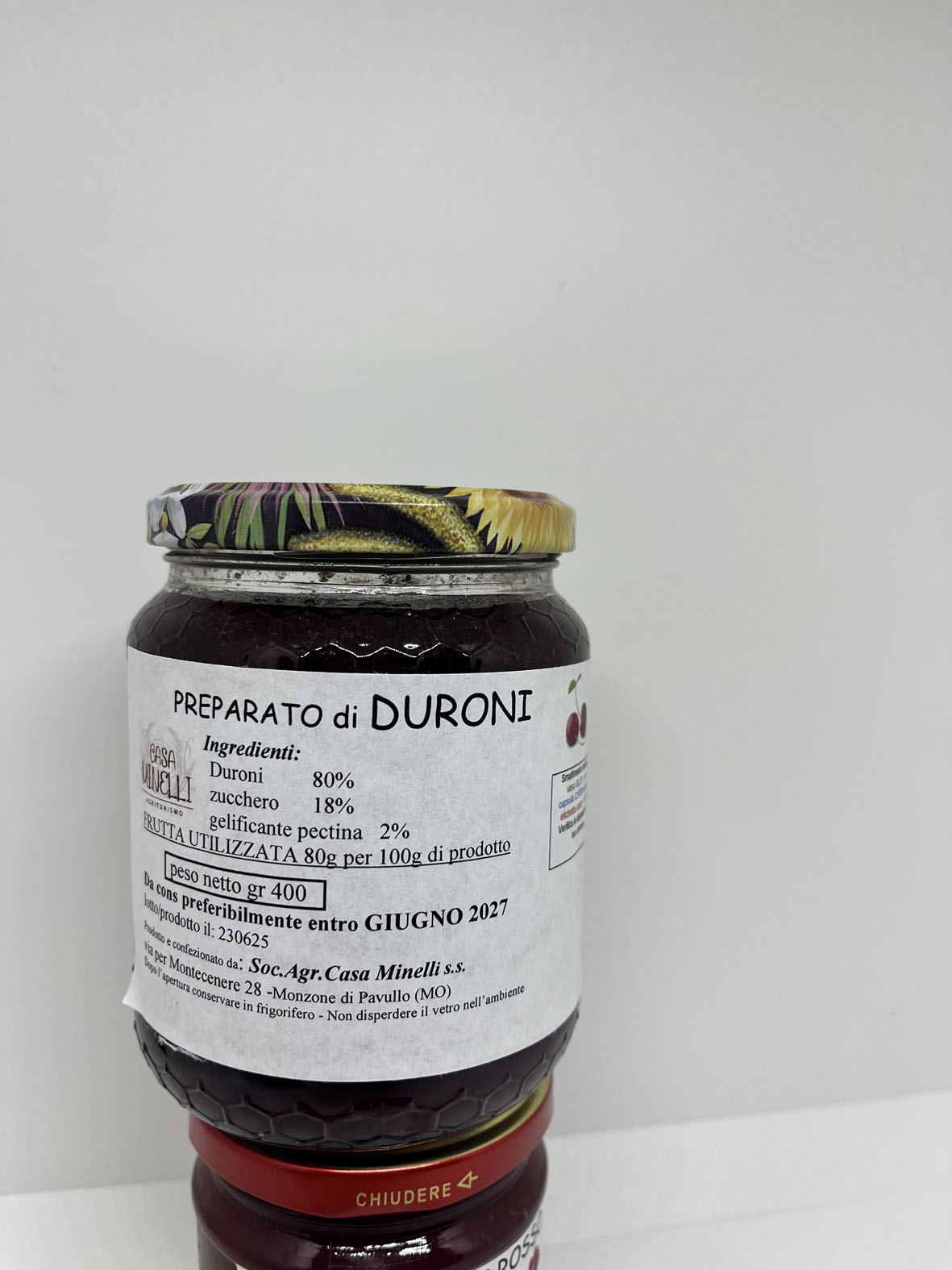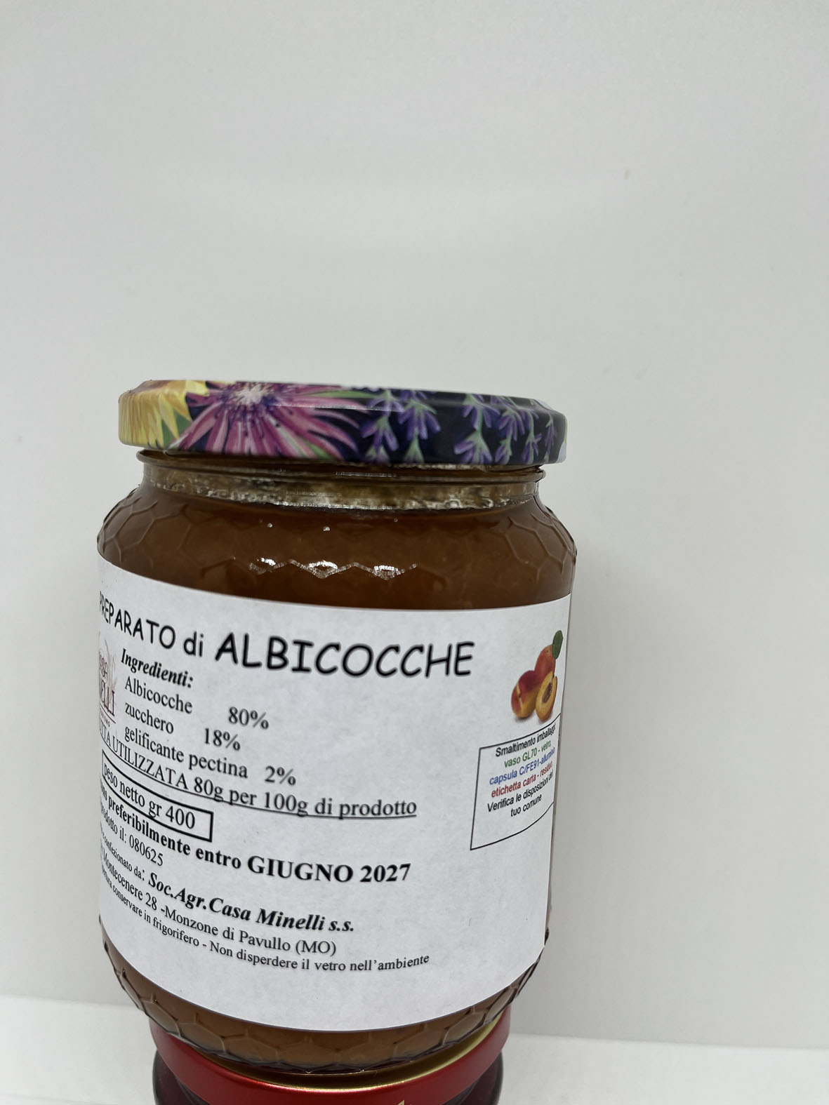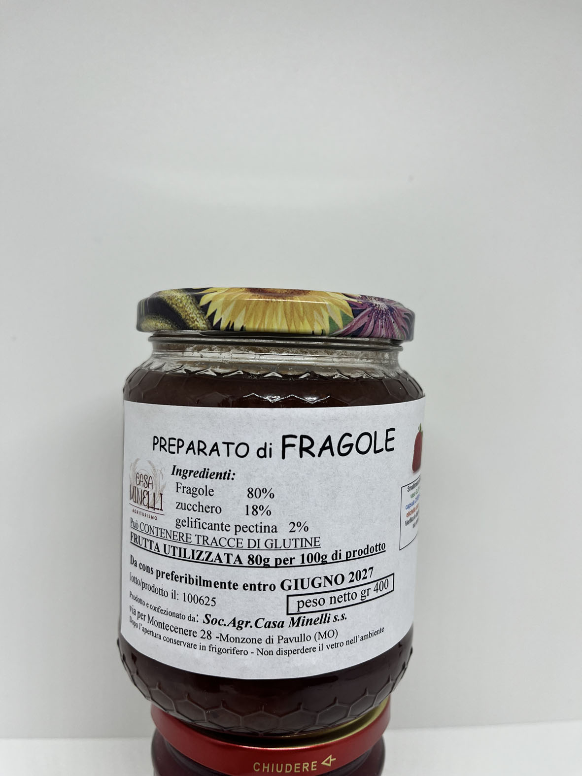 Le confetture vengono preparate con la frutta raccolta e trasformata, entro le 24 ore, direttamente nel laboratorio aziendale a Km 0 per preservare maggiormente un risultato fresco, genuino e il più possibile naturale, senza aggiunta di coloranti, additivi e conservanti, ma soprattutto senza glutine.